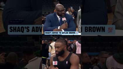 Jaylen Brown speaks with Shaq and the NBA TV GameTime crew after the Boston Celtics win in Game 2 over the Dallas Mavericks in the NB...
