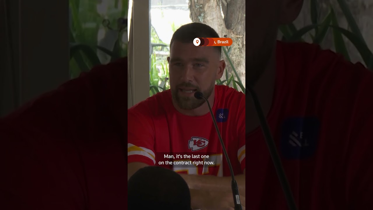 Travis Kelce discusses being off the market as an engaged man following a light workout in Sao Paulo, Brazil, before the Kansas …
