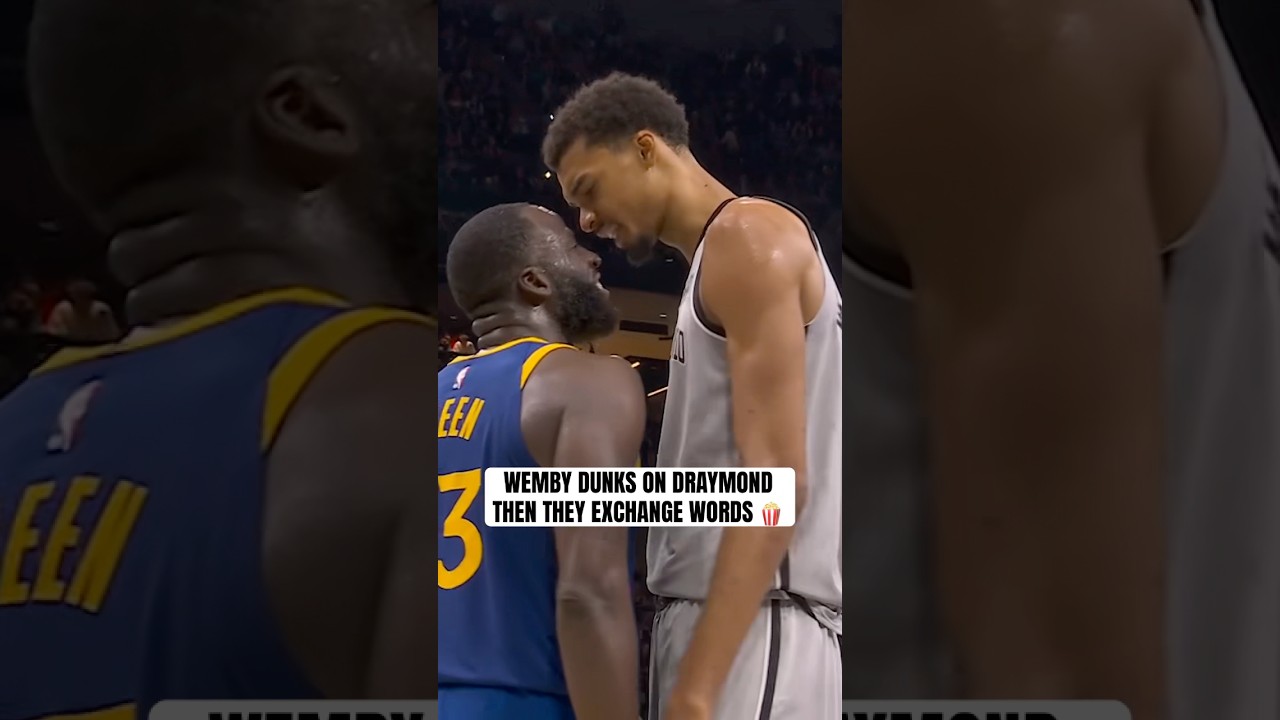 Victor Wembanyama dunks on Draymond Green, then the two exchange words right after #nba #victorwembanyama #warriors.